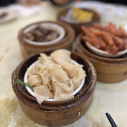Good variety of dim sum options here with all of the classics (chang fen, xia jiao, shao mai, etc.). I'm personally partial to the lo bo gao, always a must-eat dish at any dim sum place. Definitely get the dou hua here- it counts as a small dish in price and has great flavor. The dou hua is silky smooth with a pleasant soy taste, and the accompanying sugar ginger water you eat it with has the perfect balance between the two flavors. The chinese broccoli was also quite flavorful, stir-fried in a savory siy sauce with garlic. Only disappointing note was that the zhi ma qui was very light on the filling (the space is mainly taken up by the chewy ball part), but even then, the taste was good and it had a nice chewy mouthfeel. Service is dim sum style where they push dishes around on carts. You can order in Cantonese (probably Mandarin too, if I overheard another table correctly), but English also works. (Or, in a more efficient manner, just nod when they show/point the dishes you want lol.) If you're eating at a busy time, you might have to wave them down to get the carts to come to your table. The inside space is very spacious and can seat large parties. The clientele appear to be mainly older Asian people, but there was also a reasonable amount of younger and/or non-Asian customers when I visited. I believe wedding parties have been hosted here, too. The bathrooms are decent and clean enough.